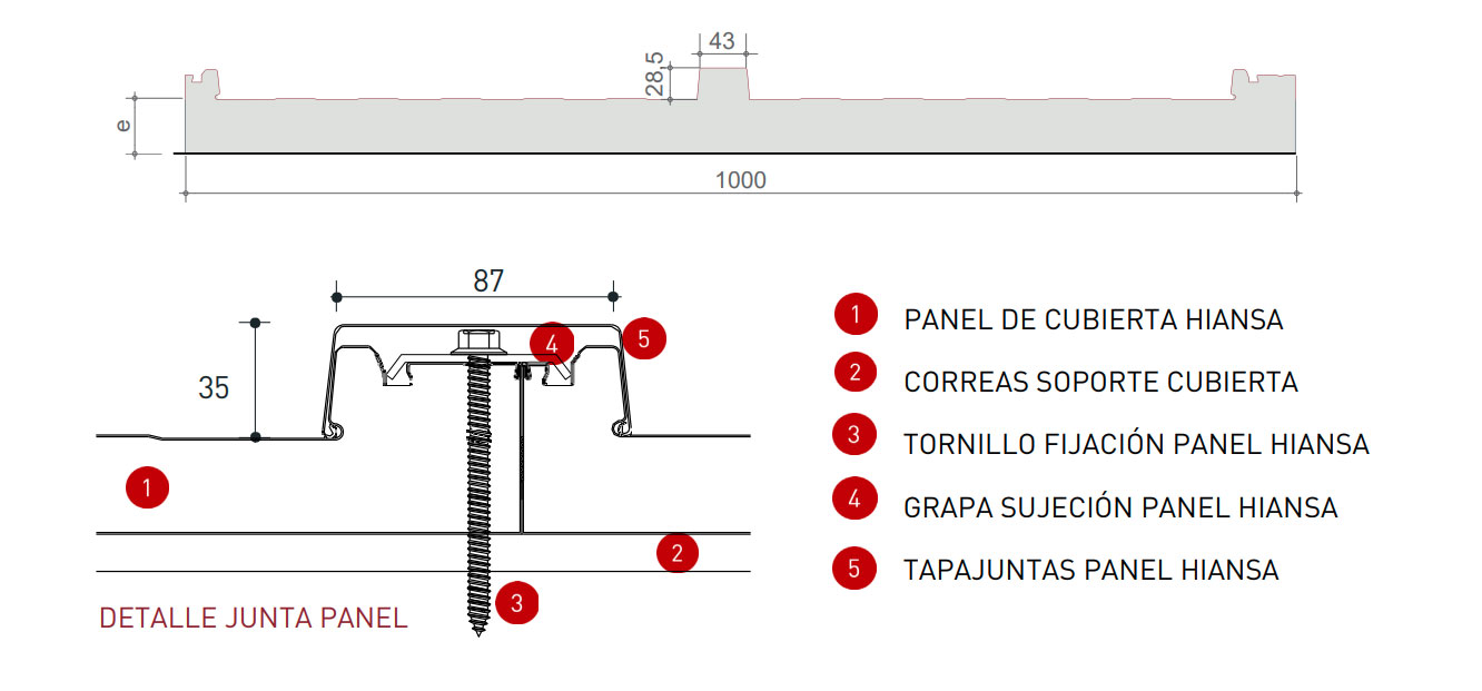 Solape transversal entre paneles de cubierta sin tapajuntas (concebido para aguas de longitud considerable, donde el tamaño máximo de panel resulta insuficiente).