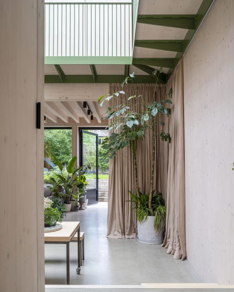 Ubicada en un discreto callejón de Tottenham, al norte de Londres, Green House sorprende desde el primer momento. Su amplio patio ajardinado, que funciona como un vestíbulo exterior, da la bienvenida a un espacio donde el diseño moderno y la naturaleza conviven en perfecta armonía. Destaca además su fachada única, marcada por una pared de láminas corredizas de policarbonato, que contrasta con las tradicionales fachadas de ladrillo que predominan en el vecindario.
