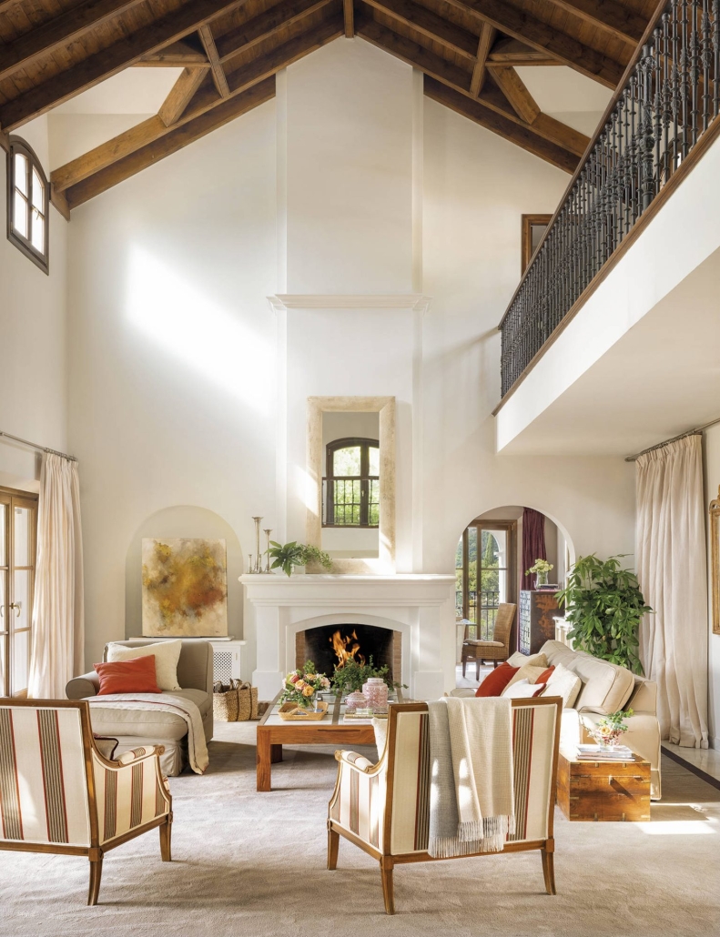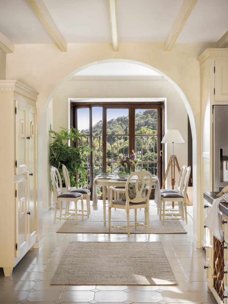 Una vez dentro, nos reciben los altísimos techos a dos aguas, adornados con vigas de madera que evocan la arquitectura tradicional andaluza. La balaustrada de hierro que se asoma por el falso techo del salón añade un toque de elegancia y autenticidad, recordándonos la influencia cultural que permea cada aspecto de la casa. Los amplios espacios se inundan de luz natural, creando una sensación de amplitud y calidez que invita a sentirse en casa desde el primer momento.