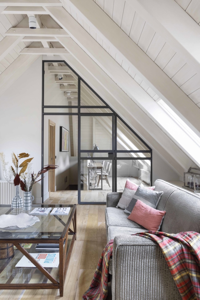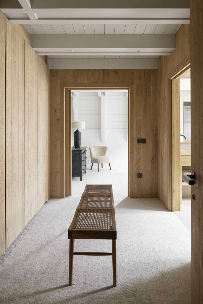 Una de las dificultades principales durante el proceso fue adaptar el mobiliario al sistema de calefacción existente, especialmente los radiadores en el salón, que requerían una solución creativa para integrarlos de manera armoniosa en el diseño interior. Además, se optó por pintar los techos de madera en tonos claros para aumentar la sensación de amplitud y luminosidad en los espacios, y se panelaron las paredes en áreas de armarios para una apariencia más uniforme y elegante.