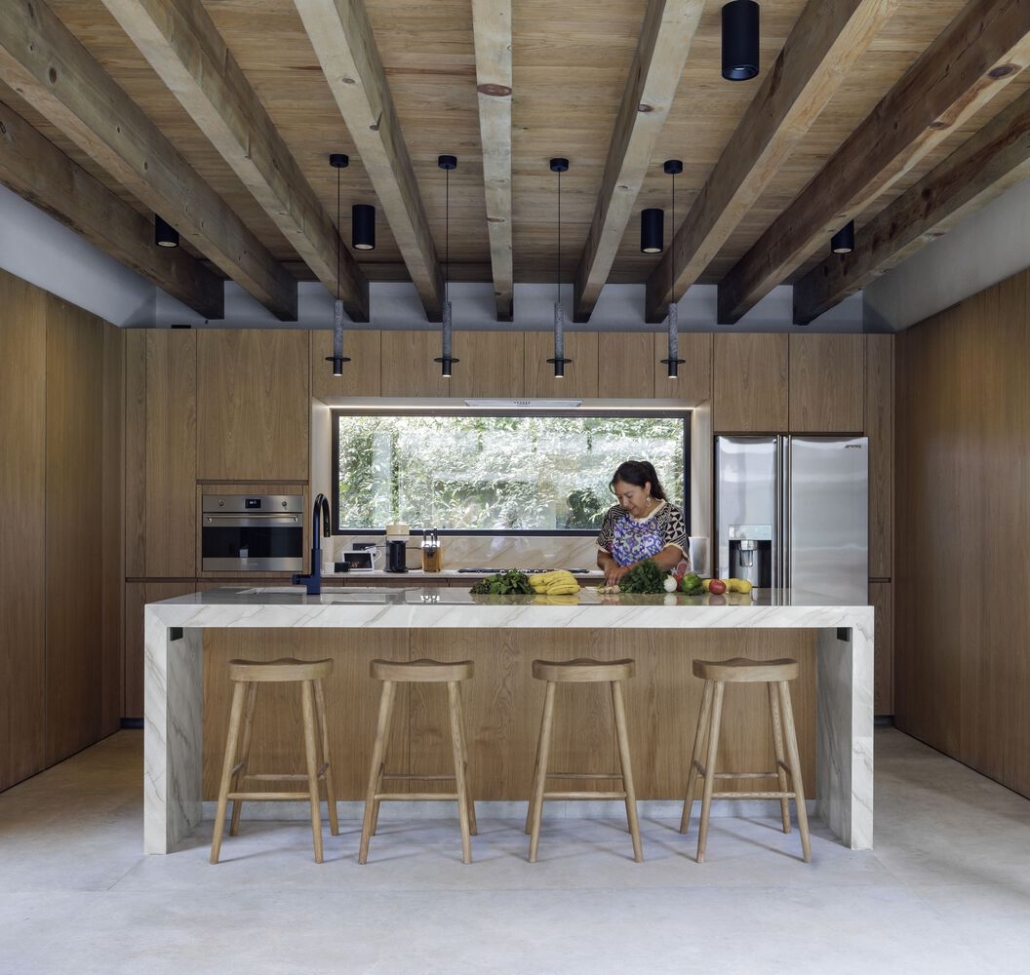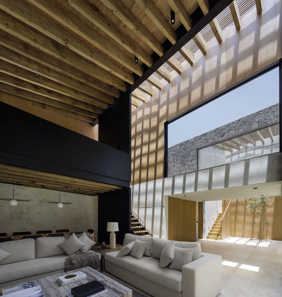 En el cuerpo más pequeño se encuentran los espacios sociales: la sala, que está diseñada con una doble altura para aprovechar al máximo la luz natural y ofrecer una sensación de amplitud; el comedor, que conecta directamente con la sala; y un estudio en mezzanine, que se integra como una extensión vertical del área social. Uno de los elementos más destacados de este volumen es la gran terraza cubierta, que se proyecta como una extensión de la sala y se convierte en el espacio más dinámico de la casa. Esta terraza techada es, en muchos sentidos, un espacio intermedio entre el interior y el exterior, una zona donde los límites entre ambos se difuminan. Es un área flexible que puede entenderse tanto como un espacio exterior cubierto o como una sala interior abierta, dependiendo del uso que se le quiera dar. Esta característica permeable de la terraza le otorga una gran versatilidad, ya que se conecta directamente con el jardín y la piscina, lo que la convierte en el lugar ideal para actividades al aire libre o simplemente para disfrutar de las vistas y la frescura del entorno. Además, la terraza se comunica lateralmente con la cocina, que actúa como un espacio de transición entre los dos cuerpos principales de la casa.