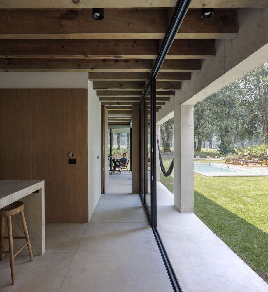El cuerpo longitudinal, que alberga las áreas privadas y de servicio, está diseñado para ofrecer tanto comodidad como funcionalidad. Aquí se encuentran la cocina, las habitaciones, una bodega, el estacionamiento y las áreas de servicio. Este volumen también está rodeado por un pórtico perimetral, un elemento arquitectónico que tiene múltiples propósitos: proporciona sombra, protege los espacios de la planta baja y crea terrazas cubiertas que permiten disfrutar del exterior incluso en días lluviosos. Este pórtico no solo ofrece un refugio contra las inclemencias del clima, sino que también añade una capa adicional de conexión entre los espacios interiores y el entorno natural, permitiendo a los ocupantes disfrutar de la lluvia y las vistas sin salir completamente al exterior.
