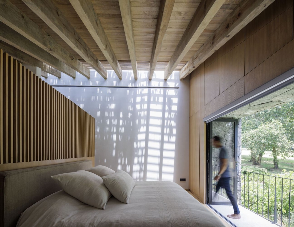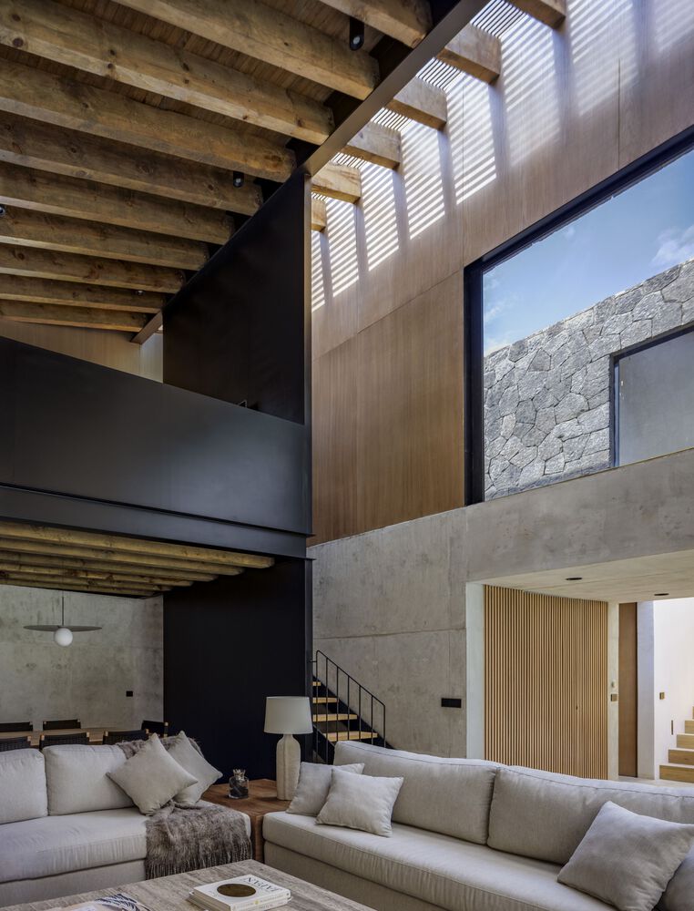 El uso de hormigón aparente en los interiores continúa el concepto de cohesión entre el exterior y el interior de la vivienda. En el interior de la casa, el hormigón se utiliza para crear espacios sobrios y modernos, mientras que la piedra volcánica, que en el exterior tiene un carácter robusto y pesado, se convierte en paneles de madera en el interior. Este cambio de material en el interior de la parte superior de la casa no solo aporta ligereza y calidez a los espacios, sino que también añade una sensación de confort y hospitalidad. La madera, con su textura suave y tonalidades cálidas, contrasta de manera efectiva con la dureza del hormigón, creando un equilibrio perfecto entre lo rústico y lo moderno.