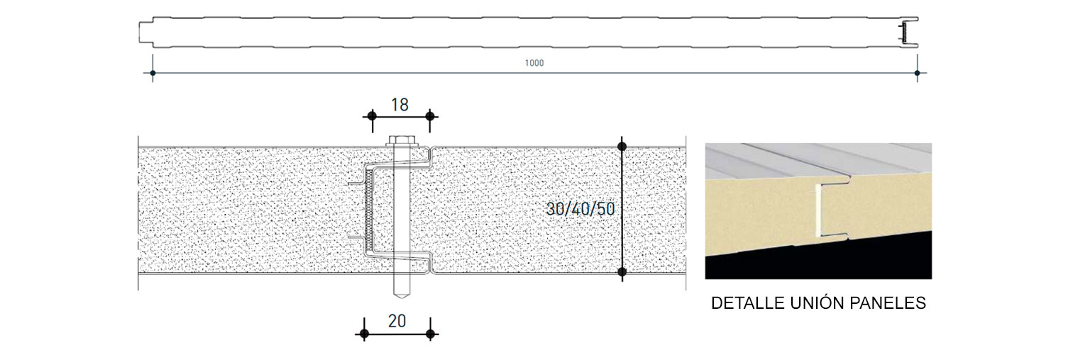 Panel para cerramiento de fachada compuesto por 2 chapas de acero y núcleo aislante PUR o PIR que garantiza las máximas prestaciones de aislamiento térmico. Se puede instalar tanto en vertical como en horizontal. En ambos casos la unión entre paneles es mediante junta machihembrada con sistema de tornillería con fijación vista.