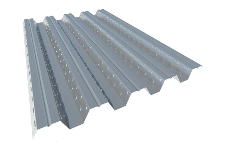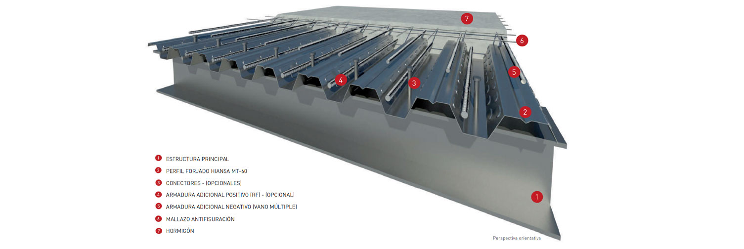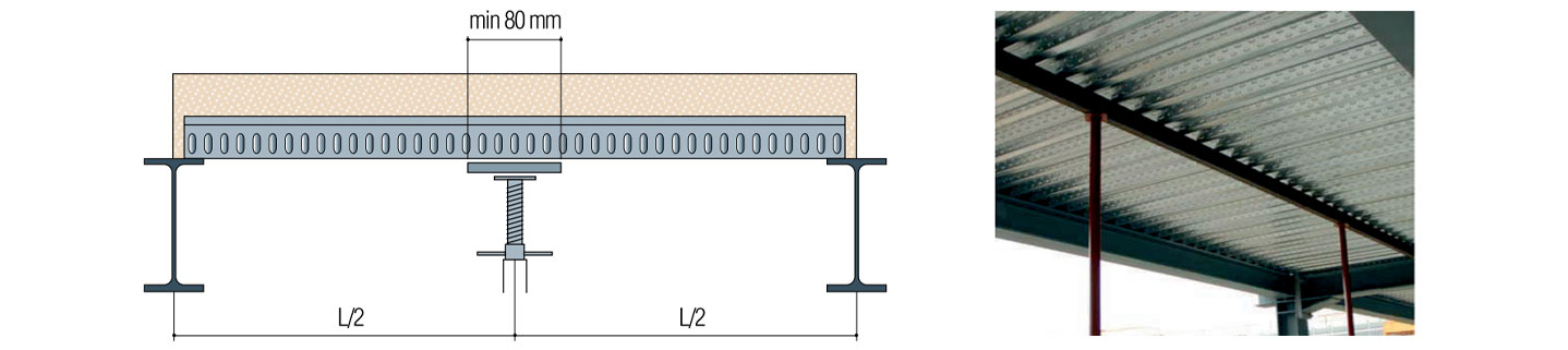 El usuario de las tablas de sobrecarga del forjado compuesto con perfil MT-60, puede extrañarse al comprobar como, en un determinado momento, al aumentar en 1 cm el canto de la losa de hormigón, la sobrecarga admisible baja de manera significativa. Este salto en los valores corresponde a la entrada en la zona de apuntalamiento, sombreada en rosado de las tablas. Esto se debe al diferente enfoque teórico que sostiene el estudio y comprobación de una estructura no apeada y apeada (según recoge la Normativa Eurocódigo 4 y Eurocódigo 3). Una chapa de acero no apuntalada, en fase de ejecución del forjado, se deforma proporcionalmente al peso propio del hormigón vertido.