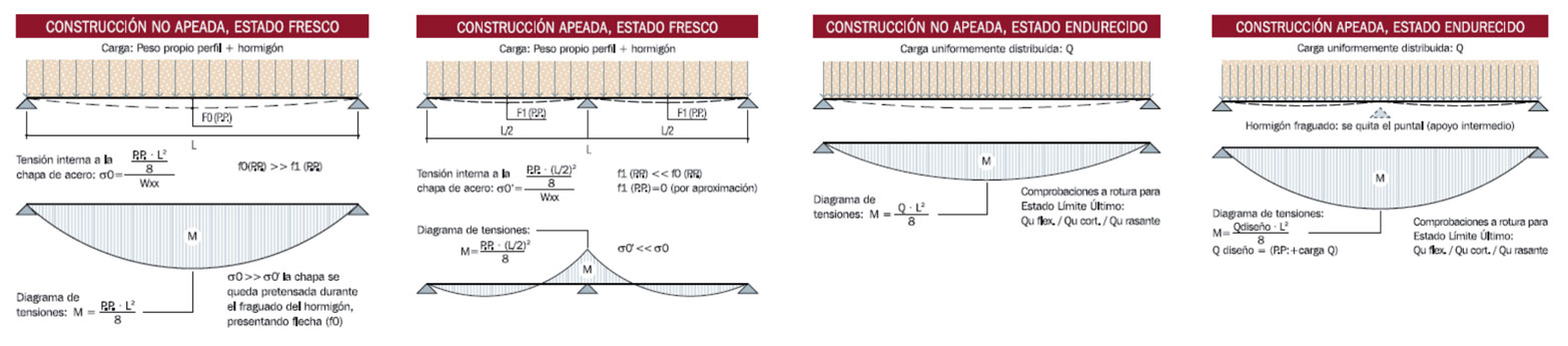 En las estructuras apeadas, el puntal intermedio parte en dos la luz libre entre apoyos, y la flecha (f0)’ que se registra es sensiblemente inferior a la flecha f0 (registrada por el mismo forjado no apuntalado). Por aproximación se puede afirmar que la flecha f0’ es igual a 0. Durante el fraguado, el hormigón la chapa no presenta tensión, siendo el puntal que aguanta el peso propio del hormigón vertido. Una vez fraguado el hormigón, quitando el puntal y aplicando a la estructura una carga Q, se comprueba el forjado a todas las solicitaciones presentes. Una vez más el colapso se produce por alcanzar el Estado Límite Último a momento rasante. En este caso, la carga Q determina la rotura de la losa. En las tablas de sobrecarga admisible no es lícito añadir el peso propio del forjado registrado durante el ensayo al momento de la losa.