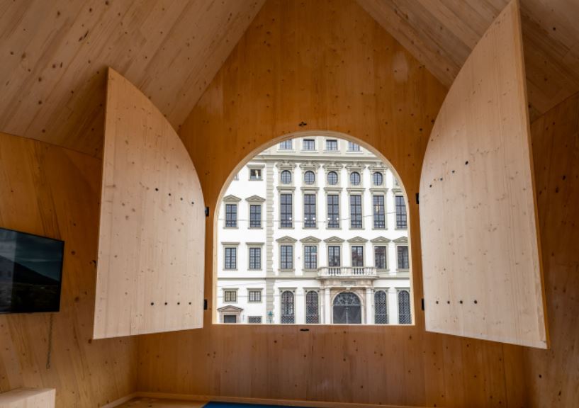En el interior del pabellon madera panel sandwich, los visitantes podrán ver una exposición sobre la «Fuggerei del futuro». El equipo de diseño estudió el complejo existente en Augsburgo y perfeccionó la fórmula del complejo para garantizar el éxito de la vivienda social, manteniéndose en línea con el «Código Fuggerei» recientemente redactado. El resultado son ocho sencillos «bloques de construcción» que proporcionan una base o referencia para el nuevo Fuggerei, que puede adaptarse a diferentes contextos globales. Estos bloques también están referenciados en la circulación y distribución interior del pabellón, con ocho espacios diferentes para la exposición y los eventos.