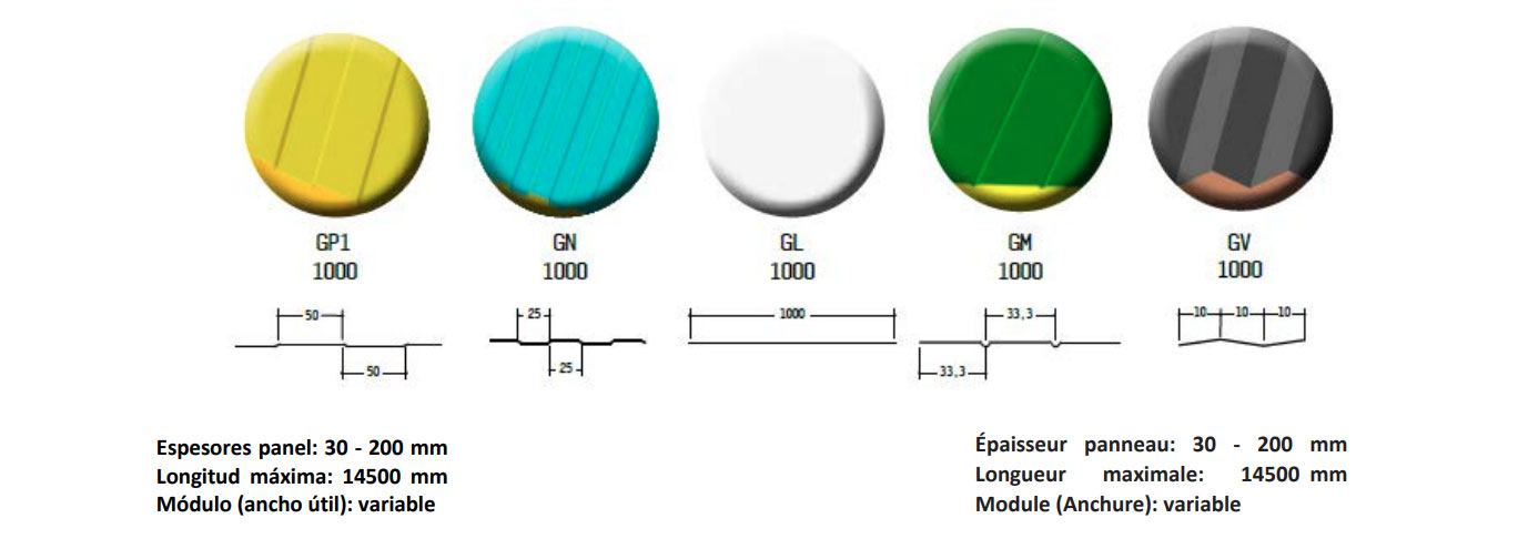 Los paneles están formados por una lámina de acero en cada cara y por un núcleo de espuma de poliuretano con gran aislamiento térmico. Están concebidos para la construcción de fachadas de edificios industriales, comerciales y divisiones en general.