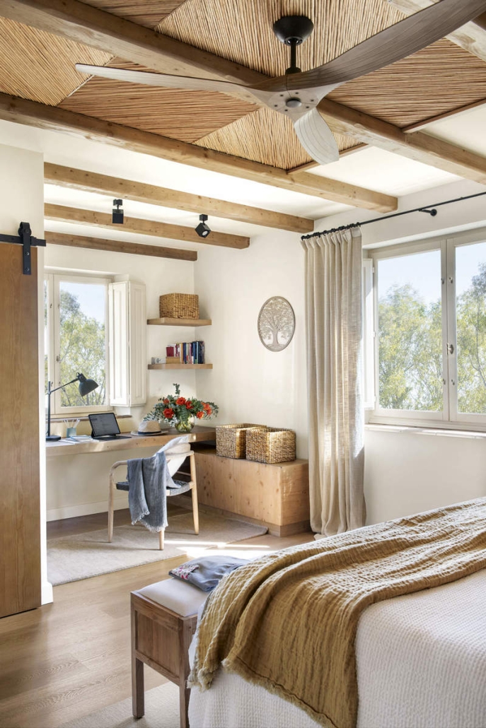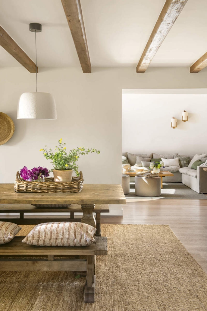 Las paredes se repintaron en tonos más suaves y naturales, buscando crear un ambiente acogedor y en armonía con el entorno. «El blanco roto y los tonos tierra fueron los elegidos para dar la sensación de luminosidad sin perder el carácter rústico», comenta Marina. Además, se trabajó mucho en la textura de las paredes para que recuperaran su aspecto envejecido, típico de las masías antiguas.