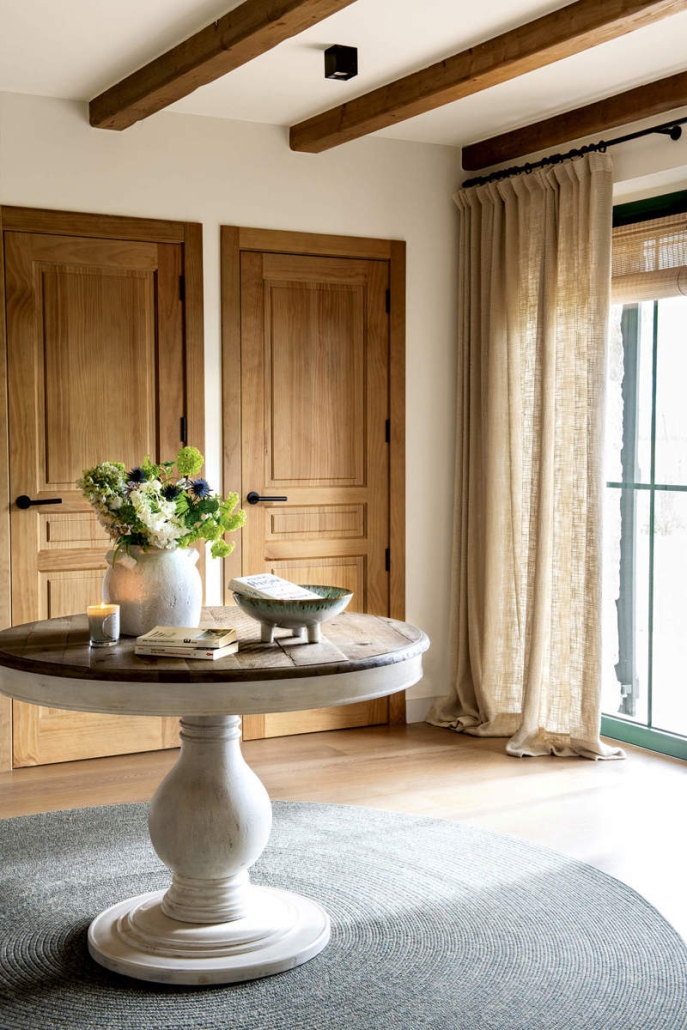 Las interioristas Marina y Laia Reguant, responsables de la transformación, nos explican: «El interior de la casa no tenía sentido. Las vigas originales habían sido sustituidas por estructuras metálicas oscuras que no aportaban calidez. Las paredes, pintadas en colores llamativos, contrastaban de manera chocante con el espíritu rústico del lugar. El suelo porcelánico, aunque práctico, resultaba frío y carente de la conexión con la tierra que caracteriza a estas viviendas. La cocina, además, parecía propia de un apartamento en la ciudad, completamente desubicada en el contexto de una masía rural».