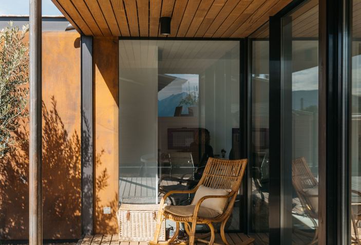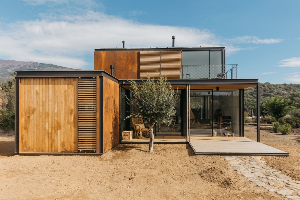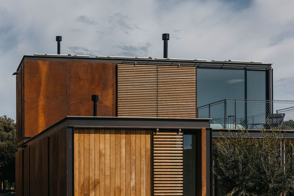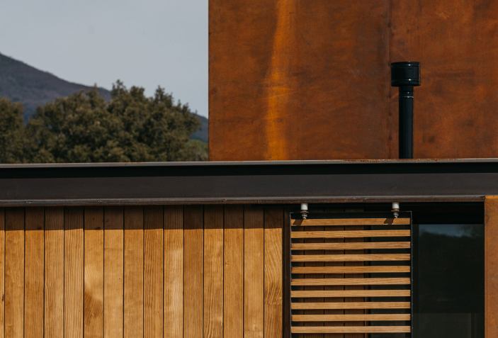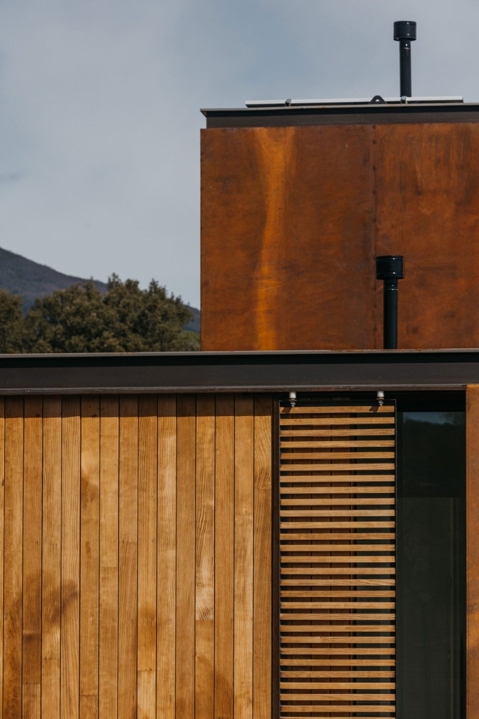 Los materiales elegidos por Tini, como el acero corten y la madera termotratada en las fachadas, confieren un carácter distintivo a la edificación. Además, se ha priorizado la eficiencia energética y económica mediante la instalación de paneles solares en la cubierta, así como la utilización de suelo radiante y un acabado cerámico en el suelo.